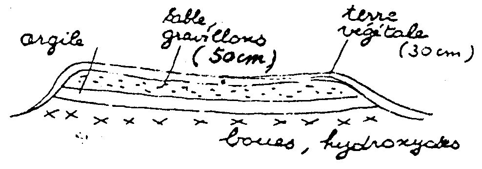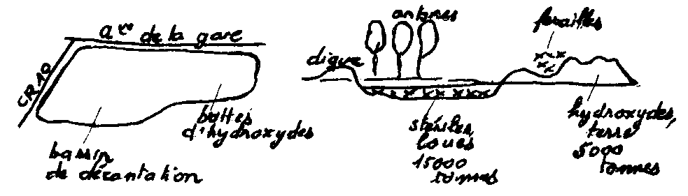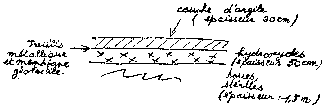 2. Travaux préliminaires (durée 8 semaines) · Aménagement du chantier · Evacuation des ferrailles · Débroussaillage du terrain. Une cartographie des émissions de radon et de rayonnement sera réalisée à la fin de ces travaux préliminaires. 3. Mise en place de la couche d'argile La durée prévue pour les travaux de terrassement (non compris le temps nécessaire pour la stabilisation des sols) est de 4 mois si les conditions météorologiques sont favorables. · Transfert des hydroxydes dans le bassin de décantation. ![]() · Mise en place de la couche de 30 cm d'argile. ![]() A l'issue de cette phase, des mesures de radon et de rayonnement seront effectuées par le Service de Protection contre les Rayonnements du Centre de Saclay et l'Institut de Protection et de Sûreté Nucléaire. D'autres laboratoires qui seraient intéressés pourront y être associés. Si les résultats sont insuffisants, une couche d'argile supplémentaire sera mise en place. 5. Mise en place des matériaux de recouvrement Les matériaux de recouvrement sont constitués d'une couche drainante puis de terre végétale (épaisseur 30cm). ![]() · Engazonnement · Rectification du carrefour. Des échantillons, notamment de flore et de terre prélevés pour conservation à chacune de ces étapes pour conserver une mémoire du terrain. Les travaux sont réalisés sous la responsabilité du Directeur du Centre de Saclay par une unité spécialisée du CEA. Ils sont effectués en concertation avec l'Institut de Protection et de Sûreté Nucléaire sous l'autorité du Préfet et sous le contrôle de la Direction Régionale de l'Industrie et de la Recherche (DRIR) p.9