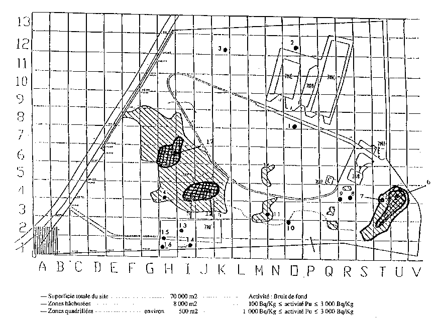à Destinataires in fine Afin d'apporter toute l'information nécessaire sur l'état de cette aire de transit, et pendant qu'un travail d'archives était parallèlement mené, le Commissariat à l'Energie Atomique a pris début novembre 1990 l'initiative d'une campagne de mesures approfondies. Dans un souci de transparence, elle a été menée contradictoirement entre les laboratoires du CEA, de l'Institut de Protection et de Sûreté Nucléaire et de ceux de l'Institut National de Physique Nucléaire et de Physique des Particules du CNRS. Pendant quatre mois, une dizaine de laboratoires ont élaboré des protocoles de prélèvements, entrepris et mené à bien les mesures nécessaires à la détermination des teneurs en radioisotopes contenus dans les terres. Certaines de ces mesures telles que celle du plutonium sont délicates et longues aux bas niveaux d'activité observés. Ce travail a été conduit méthodiquement et rigoureusement et je tiens à remercier tous ceux qui y ont participé. De la confrontation scientifique est ressortie une très bonne cohérence entre les résultats des différents laboratoires. Sur les 7 hectares du terrain, on peut estimer que les terres contiennent 0,2 gramme de plutonium, c'est-à-dire 0,5 GBq; l'activité massique n'excède 1.000 Bq/kg que sur une superficie de l'ordre du centième de la superficie tolale. Pour sa part, la quantité de 137 Cs est estimée inférieure au milligramme. A ces activités diffuses contenues dans les boues en provenance des stations de traitement des eaux du Centre d'Etudes de Saclay, on doit ajouter celles provenant de sept grains de quelques milligrammes contenant du 60 Co qui ont été prélevés et des traces de radium en un endroit localisé. (suite)
