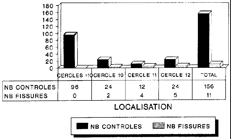 Seule la traversée 53 présente une fissure longitudinale dans la zone hors soudure (partie libre de l'adaptateur) Aucune fissure circonférentielle en paroi interne ou externe n'a été observée. 4.5 Synthèse des contrôles des 3 couvercles CPO (FESI, BUG3,BUG4) 4.6.1 Events Sur les 3 évents contrôlés aucune indication de type fissure n'a été relevée en peau interne du tube. 4.6.2 Adaptateurs Aucune fissure circonférentielle en paroi interne ou externe n'a été observée sur les 156 adaptateurs contrôlés. Onze d'entre eux, situés sur les cercles les plus périphériques, sont affectés de fissures longitudinales. La répartition des adaptateurs contrôlés en fonction de leur position sur le couvercle est illustrée par le graphe 4.6.2.1: ![]() La répartition des adaptateurs fissurés est illustrée par le graphe 4.6.2.2: ![]() Ces fissures se développent préférentiellement