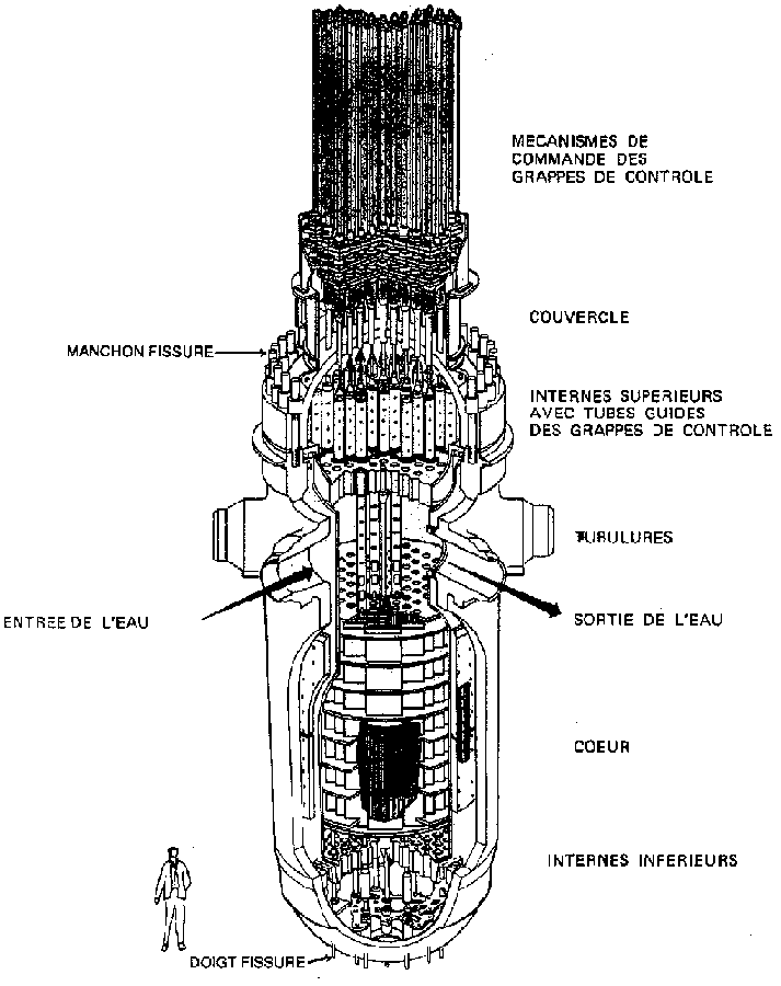1.1 Objet de la note L'inétanchéité de la traversée T54 du couvercle de la cuve de Bugey 3 a été détectée le 23/09/91 lors de l'épreuve hydraulique décennale réglementaire du Circuit Primaire Principal (CPP). Electricité de France a décidé de réaliser des contrôles sur les tranches CP0 en arrêt pour rechargement (Bugey 4 et Fessenheim 1); ceux-ci ont montré la présence de fissurations longitudinales sur certains adaptateurs. Le but de la présente note est de faire une synthèse des actions entreprises ou prévues pour comprendre et expliquer ce phénomène. Ces actions concement en priorité les tranches du palier CP0, et en particulier les tranches de Fessenheim 1 et 2. 1.2 Position d'EDF pour les tranches CP0 L'ensemble des éléments disponibles à ce jour: - contrôles non destructifs et expertises, - calculs mécaniques, - mesures de contraintes résiduelles, montre que le phénomène, à l'origine des dégradations constatées sur les adaptateurs du palier CP0, est un phénomène générique de corrosion sous contrainte de l'alliage 600 en milieu primaire. Bien que les dégradations constatées à ce jour ne comportent pas de risque pour la sûreté, la possibilité d'une fuite d'un adaptateur ne peut être exclue, ce qui serait de nature à hypothéquer significativement la disponibilité. Ce risque industriel a conduit EDF à la décision de Remplacer tous les couvercles CP0 dans un délai de 2 ans pour le premier et 3 ans pour le dernier. Dans cette période transitoire, les dispositions complémentaires suivantes sont mises en oeuvre: - installation de dispositifs anti-éjection sur les couvercles des six tranches CP0; en ce qui conceme Fessenheim, le pro-gramme d'installation est le suivant: - Tranche 1: lors d'un arrêt intermédiaire à l'automne 92, - Tranche 2: avant redémarrage (arrêt en cours). - installation de systèmes de détection de fuite sur les couvercles des six tranches CP0; en ce qui conceme Fessenheim, le programme d'installation est le suivant: - Tranche 1: réalisé au précédent arrêt pour rechargement, - Tranche 2: avant redémarrage (arrêt en cours). - contrôle complet à l'aide du robot des couvercles des tranches CP0; en ce qui concerne Fessenheim, le programme est le suivant: - Tranche 1: au prochain arrêt pour rechargement,un contrôle partiel ayant été réalisé au précédent arrêt, - Tranche 2 : avant redémarrage (arrêt en cours), sauf en cas d'indisponibilité du robot de contrôle (dans ce cas, un programme de repli serait mis en oeuvre portant sur les zônes les plus potentiellement affectées). - pas de réparation de traversée sauf Si elle est fuytarde ou avec une fissure traversante au dessus de la soudure. 2. Description des matériels