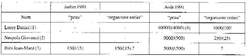 1) Leroy Daniel - "Manutentionnaire" de Manpower - Contrat du 06/08/91 au 31/08/91 (film porté du 06/08/91 au 19/08/91) 2) Nespola Giovanni - "Manutentionnaire" de Manpower - Contrat du 01/08/91 au 09/08/91 renouvelé du 10 au 31/08/91 (film porté du 05/08/91 au 14/08/91) 3) Biès Jean-Marc - "Opérateur" de Manpower - Contrat du 29/06/91 au 02/08/91 avant son embauche à EBS 4) L'équivalent de dose de 9900 millisieverts (990 rerus) attribué à Leroy en août 91 et figurant sur le relevé dosimétrique du LCIE correspond, en fait, à la valeur maximale qui peut être imprimée par le programme d'impression de résultats dosimétriques du Laboratoire. La valeur de 40.000 millisieverts (4 000 rems) résulte d'une évaluation effectuée par référence à une source de strontium 90. 50 Les limites réglementaires d'équivalents de dose, définies par le décret du 02/10/86 sont: - 500 millisieverts par an (50 rem/a) pour la peau - 50 millisieverts par an (5 rem/a) pour l'organisme entier p.25