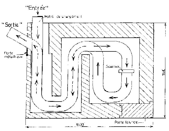 L'accélérateur, constitué d'un transformateur (360 V/3,6 kV) et du système d'accélération, a été placé dans une cuve métallique de fabrication hollandaise achetée en Suisse à la Société Studer (Dl 19 et D152). Cette cuve, qui renferme de l'hexafluorure de soufre (SF6) sous une pression de 6 bars, a été installée, ainsi que le "scanner" (système de balayage du faisceau d'électrons) par la Société Vivirad pour la Société Ionest. Le matériel, livré le 9 août 1989, a été réceptionné le 20 février 1990. Or, la cuve ne répond pas aux normes françaises relatives aux installations électriques et aux appareils sous pression. C'est ainsi qu'une expertise de l'Apave, initiée par les repreneurs de la Société Ionest, signale (02/10/90) plusieurs malfaçons et non-conformités électriques affectant la machine, ainsi que l'absence de poinçonnage de la cuve et de son réservoir de SF6 attestant de l'épreuve officielle à la pression (loi du 28/10/43). Le 12 mars 1991, la Drire de Lorraine signale cette infraction, et bien d'autres, à la réglementation relative aux appareils à pression au Procureur de la République de Sarreguemines et propose l'application de sanctions prévues par la loi. Pour échapper à cette contrainte réglementaire, la Société EBS décide de fonctionner à moins de 4 bars et de réduire consécutivement à 1,7 MV la tension d'accélération (qui est de 2,3 MV sous 8,3 bars). Le bâtiment n'a pas été étudié par l'installateur de l'accélérateur, tandis que le tracé de la casemate d'irradiation et de la chicane d'accès ont été imposés au fabricant du convoyeur. La partie supérieure du bâtiment qui abrite notamment la cuve de l'accélérateur n'avait ni escalier, ni toit, ni murs construits lorsque démarre l'installation de la cuve et de l'accélérateur le 26/09/89 (D 111). Le convoyeur a été étudié par la Société "Méca-Robo" de Metz et livré le 15 février 1990 (D 156). Il devait s'adapter à une installation déjà construite qui ne se prêtait pas aux courbes utilisées habituellement (D 156). En outre, aucun "cahier des charges" n'a été rédigé. Le convoyeur classique qui a été réalisé ne convient pas aux contraintes imposées par un irradiateur délivrant de très forts débits de dose, qui obligent à proscrire formellement non seulement l'emploi de matériaux plastiques, mais également de graisses et huiles diverses dont les propriétés se dégradent sous l'effet des rayonnements. Aux dommages provoqués par les rayonnements dans ces matériaux et produits divers, s'ajoute l'effet des propriétés extrêmement oxydantes de l'ozone produit par l'ionisation de l'oxygène de l'air. La fig. 1 montre une vue en plan qui situe la salle d'irradiation, la chicane parcourue par le convoyeur et l'emplacement des deux portes et du "scanner". La fig. 2 présente une vue perspective de l'installation. D'un point de vue ergonomique, on notera qu'il n'est pas possible de pénétrer dans la salle d'irradiation par la chicane sans escalader à trois reprises le convoyeur, ce qui ne va pas sans présenter des risques classiques élevés. p.23