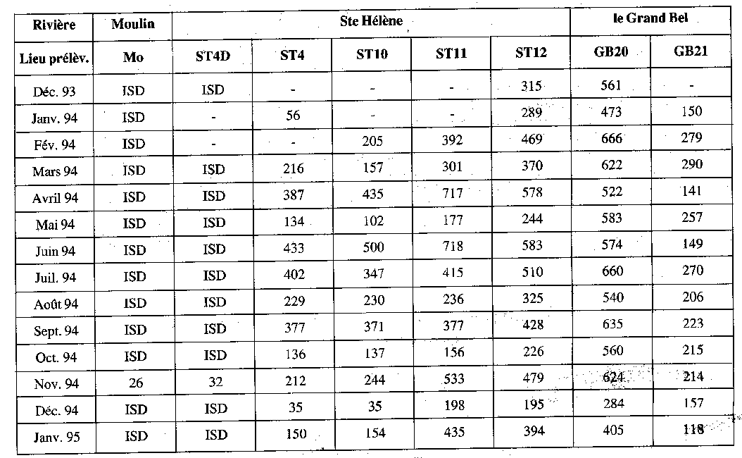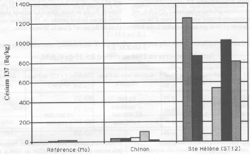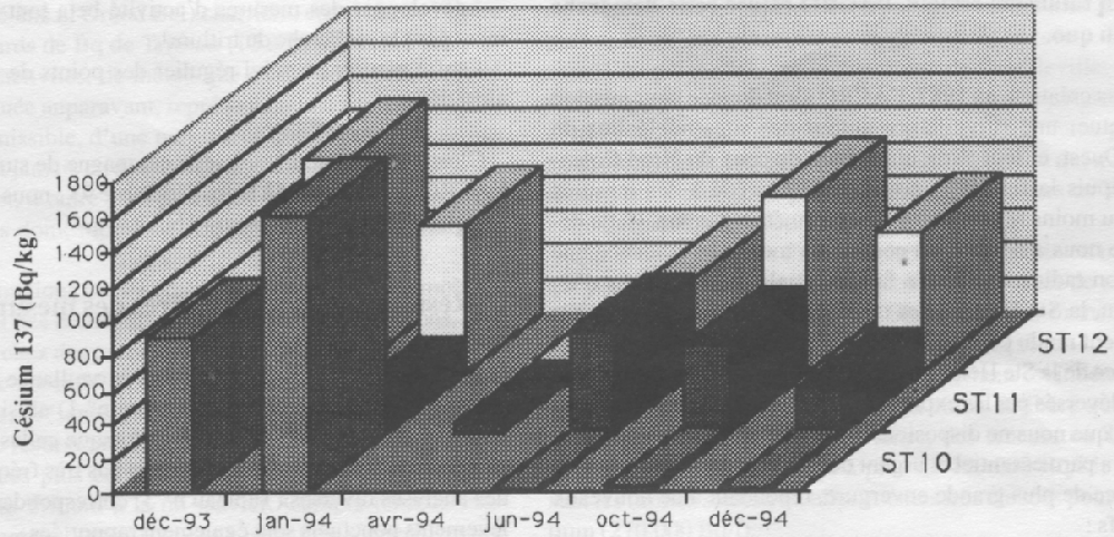La surveillance par différents laboratoires est utile: une nouvelle fois, l'ACRO trouve des valeurs dix fois plus fortes. La Ste Hélène est également sous la haute surveillance d'autres laboratoires. Pour l'année 94 (de janv. à oct.), le SPR-COGEMA enregistre ses valeurs les plus marquantes au lieu dit «La Brasserie»: elles sont toutes comprises entre 50 et 80 Bq/kg de Cs 137. Il s'agit donc de valeurs 10 fois plus faibles que celles de l'ACRO au point ST12; la différence des lieux de prélèvement peut, à elle seule, expliquer ce décalage. Pour ce qui est du Grand Bel ou de la rivière du Moulin, nos valeurs sont en bonne concordance. Contrairement à l'ACRO et au SPR-COGEMA, le LDA 50 procède d'abord au tamisage des sédiments (250 mm), ce qui a logiquement pour effet de conduire à une expression plus forte des activités massiques. Ce laboratoire effectue aussi sa surveillance de la Ste Hélène à La Brasserie mais également au Pont Durand, soit à proximité de notre point ST12. Du Cobalt 60 est parfois noté (<5 Bq/kg) par le LDA 50 et le Césium 137 est observé avec des valeurs toutes voisines de 100 Bq/kg, le maximum (147 Bq/kg) est obtenu au Pont Durand. Il s'agit donc là encore de valeurs différentes de celles de l'ACRO, notamment pour cette dernière localisation. (suite)