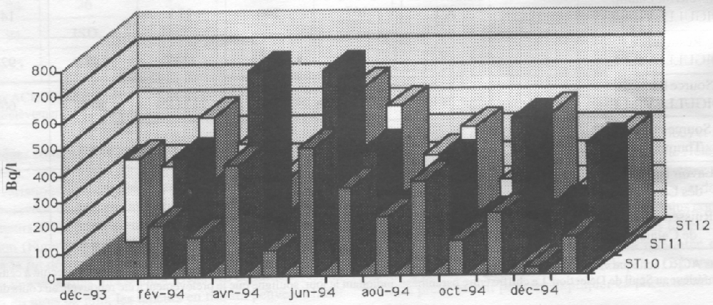 Des variations de l'activité volumique en fonction du temps sont observées et sont en fait (inversement) corrélables avec les hauteurs des précipitations qui entraînent une dilution de la pollution (Figures 2 à 4). Ce phénomène est tout à fait marquant à la fin décembre alors que les prélèvements ont été effectués lors de pluies incessantes. Dans ces conditions, et par rapport au mois de juin, les teneurs en tritium peuvent chuter d'un facteur 3 à 14 dans la Ste Hélène (selon le lieu) et seulement d'un facteur 2 dans le Grand Bel. Ainsi, la Ste Hélène apparaît nettement plus influencée par les précipitations et les eaux de ruissellement que le Grand Bel. Dans ce dernier, «l'approvisionnement» en Tritium semble donc plus constant. Alors que l'activité décroît en octobre et plus fortement encore en décembre, on constate une nette remontée en novembre. Les très faibles précipitations dans les 12 jours précédant le prélèvement peuvent expliquer ce phénomène. Néanmoins, à cette occasion (et c'est la seule fois), du Tritium est mesuré en quantité faible mais significative dans la rivière témoin (Mo) et dans une arrivée d'eaux pluviales (ST4D). Nous n'avons pu trouver d'explication. Un éventuel rejet atmosphérique intempestif par l'usine de retraitement pourrait en constituer une. · La Ste
