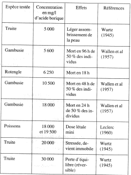 Le bore ne présente des effets toxiques sur la vie aquatique qu'à de fortes concentrations. Ces valeurs sont à rapprocher des concentration maximales rejetées sur 2 heures: 13,9 mg/1 en acide borique ou 2,3 mg/1 en bore. Ainsi SHEETS (1957) et HERMANN (1959) rapportent que la perturbation de la microfaune impliquée dans les mécanismes d'autoépuration de la matière organique n'apparaît qu'à partir de concentration en acide borique de l'ordre de 500 mg/1. Les doses létales pour le poissons sont encore plus élevées. Dans le tableau ci-dessus, il apparaît qu'il faut maintenir un poisson au moins pendant 18 heures dans une eau contenant environ 6 g/1 d'acide borique pour constater la mortalité de 50% des individus testés. ![]() Commentaire GSIEN