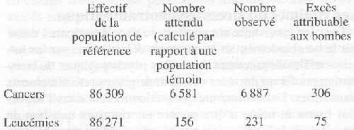 Parmi les 285.000 personnes exposées lors des explosions ou dans les semaines qui ont suivi, 80.000 étaient décédées en 1978. Une enquête particulière conceme 120.000 personnes, dont 93.000 étaient dans les villes au moment des explosions et 27.000 qui n'y ont pénétré qu'ultérieurement mais ont été exposées de façon significative. Le dernier bilan concerne une cohorte d'environ 86.000 personnes suivies entre les années 1950 et 1987. Le tableau 2 résume les principales données numériques concernant l'apparition des cancers chez les survivants. Ce tableau présente les effectifs des populations de référence, le nombre de cancers qu'il serait normal d'observer et le nombre réellement constaté. La différence entre ces deux derniers nombres correspond à l'excès attribuable à l'effet des rayonnements des deux bombes. Cet excès est de 306 pour les cancers solides et de 75 pour les leucémies. Rapportés au nombre de cancers et leucémies "normalement" attendus entre 1950 et 1987, les cancers et leucémies dus aux bombardements d'Hiroshima et Nagasaki représentent un accroissement de 5 à 6 %. La part des leucémies est, en relatif, considérablement plus importante, puisqu'environ la moitié (75/156) d'entre elles est attribuable à la bombe; la part des cancers solides est inférieure à 5 % (306/6.581). Ce chiffre souffre d'imprécisions en raison du petit nombre de personnes dans chaque catégories (classement par organe, sexe, âge, etc.).