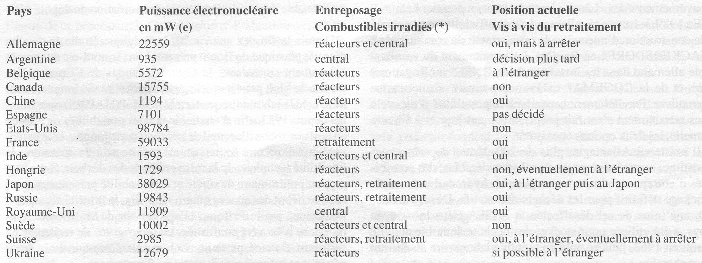 L'aval du cycle du combustible prévoyait qu'environ 1 % du plutonium produit, l'essentiel des autres actinides et l'ensemble des produits de fission seraient stockés sous forme vitrifiée de façon définitive dans les formations géologiques. Compte tenu de la révision à la baisse des programmes nucléaires, liée entre autres à la situation économique générale et à l'abondance relative des ressources en uranium, une évolution très nette s'est manifestée au plan international au cours de ces deux dernières décennies en faveur du stockage direct des combustibles irradiés. Cette évolution a démarré aux États-Unis où une politique plus stricte de non-prolifération a notamment contribué à l'interdiction du retraitement commercial à partir de 1977. Malgré la levée de cette interdiction après quelques années, l'industrie américaine n'a pas relancé le retraitement chimique des combustibles irradiés. L'évaluation des mérites respectifs du retraitement ou du stockage direct des combustibles irradiés est néanmoins complexe et ne se résume pas uniquement aux problèmes d'économie ou de non-prolifération. Quoi qu'il en soit, à l'heure actuelle seuls quelques-pays, dont la France, le Royaume-Uni et le Japon, sont en faveur de la poursuite des activités de retraitement sur le plan industriel. Les pays à programmes nucléaires limités, qui ont recours au retraitement sous contrat en France et au Royaume-Uni, sont plus nuancés dans leur attitude et tiennent compte notamment des incertitudes économiques, particulièrement du prix de l'uranium naturel et de son enrichissement. En tout cas, la situation actuelle ne semble pas favoriser dans la plupart des pays de nouveaux investissements en relation avec une politique de-retraitement conséquente. Le tableau 1 montre la situation relative au cycle du combustible usé dans les pays représentés dans le Comité Consultatif International de l'AIEA sur la Gestion des Déchets Radioactifs (INWAC)* Tableau 1: Situation dans les pays étrangers pour l'aval du