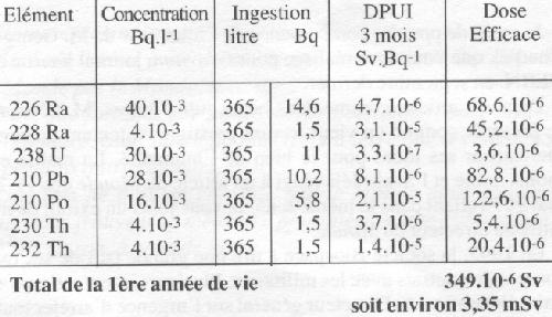 2) Doses efficaces annuelles engagées par l'ingestion d'eaux minérales non gazeuses Le volume de lait et de boisson ingéré par 24 heures chez le bébé de 0 à 1 an est d'environ 1 litre d'eau par jour, en moyenne, soit 365 litres pendant la première année de la vie. Les traces de radionucléides, ingérées avec l'eau des biberons au cours de cette année-là, s'élimineront de l'organisme en plusieurs années. Leurs effets, calculés sur la vie entière, (ici 70 ans), seront représentés par la dose efficace engagée par cette ingestion. Si l'on prend l'exemple de l'eau d'Evian, l'une des plus consommées par les nourrissons français, le tableau ci-dessous permet de voir, pour chacun des radionucléides qu'elle contient, la contribution à la dose efficace d'irradiation délivrée à l'organisme entier. Elle est obtenue en multipliant la quantité de radioactivité ingérée pendant l'année par la DPUI pour le nourrisson. La dose efficace totaie est de l'ordre de 0,35 mSv. Des valeurs similaires sont obtenues avec les autres eaux non gazeuses. La dose annuelle reçue par un adulte absorbant cette eau quotidiennement comme boisson serait 10 fois moindre. ![]() Commentaire Gazette : La dose engagée avec des eaux