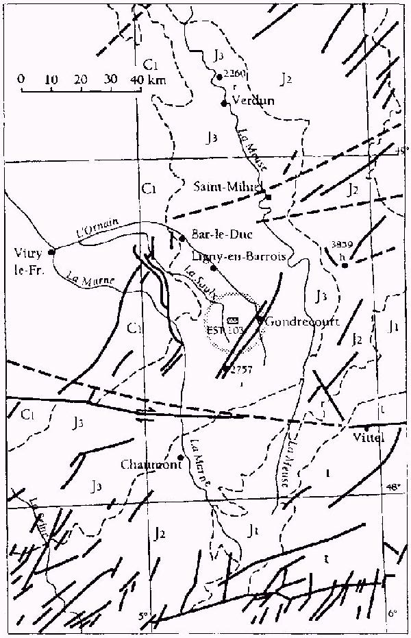 Mais il y a beaucoup plus. La carte géologique de France au 1/1.000.000 montre que le site meusien est localisé au centre d'un champ (le fractures NNE - SSW bien repéré dans les formations compétentes du Jurassique moyen en Bourgogne et en Lorraine (fig 1). Ce champ est bien plus difficile à mettre en évidence dans des formations incompétentes, telles que les argilites callovo - oxfordiennes, qui n'affleurent que difficilement, mais rien ne permet d'affirmer que ces dernières n'en sont pas affectées. Le fait que de telles fractures ne soient pas représentées sur la carte, qui ne prend en compte que les évidences, ne saurait nier la probabilité de leur existence. L'ANDRA a tendance, toujours avec optimisme, à ignorer les limites d'efficacité de la méthode sismique dans la détection des failles. et de deux façons. Tout d'abord. ses rapports géologiques n'évoquent