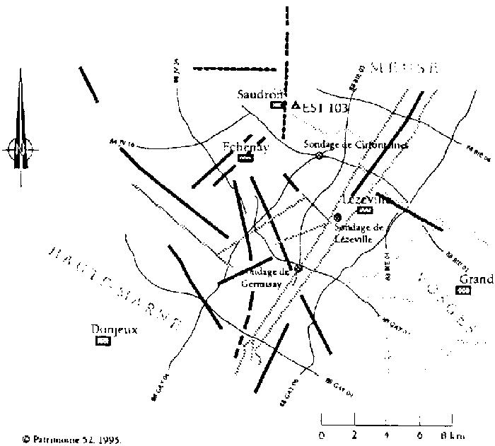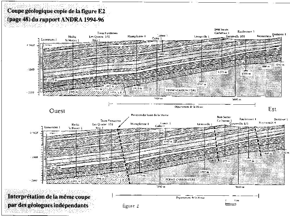 Les deux failles parallèles d'Echenay, dirigées NE-SW perpendiculaires aux trois failles SE-NW qui joignent les deux fossés de la Marne et de Gondrecourt, ne figurent pas dans le rapport de l'ANDRA (Résultats des travaux réalisés en 1994) du 6 février 1995. Pourtant l'un d'entre nous (Mourot, 30mai 1995) les a redécousertes au cours d'une visite au siège de l'ANDRA, sur les documents pétroliers retraités par la Compagnie Générale de Géophysique, voir fig.3: ![]() (suite)