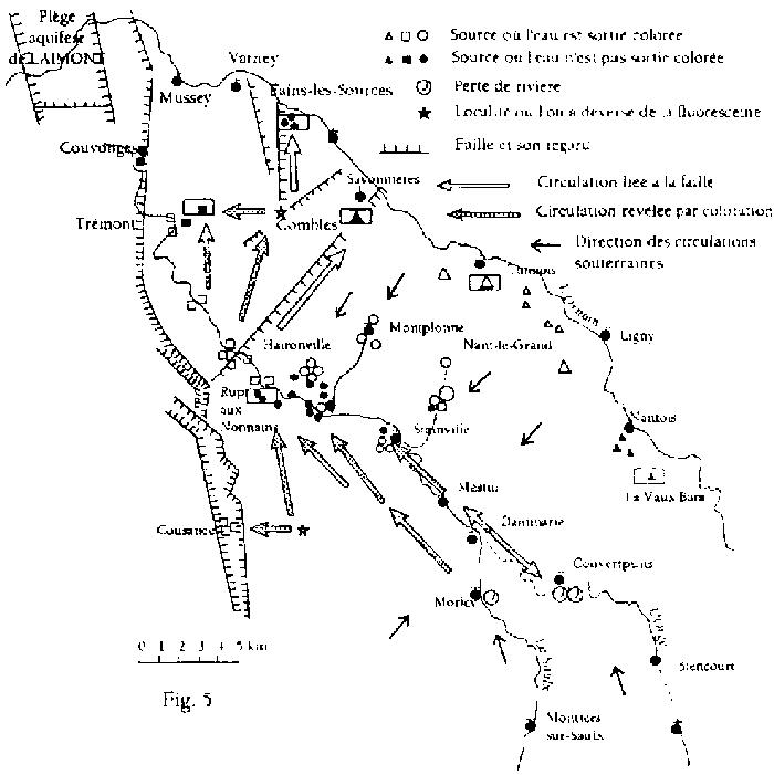 «Après remplissage des ouvrages, les vides créés lors de la réalisation du stockage devront être comblés pour rétablir autant que possible l'étanchéité du milieu et éviter que les ouvrages ne constituent des drains préférentiels pour les eaux souterraines...» (§4.3) «L'implantation du stockage... devra se situer... à une distance «suffisante» des aquifères environnants» (§ 4.5). Cette règle fondamentale ne précise pas la signification des deux termes «autant que possible» et «distance suffisante», laissant ainsi une marge de manoeuvre assez large au maître d'oeuvre. Dans un premier rapport du 6 février 1995. l'ANDRA precise «Aucun aquifère n'a été rencontré dans les deux forages ni au-dessus ni au-dessous de la couche callovo-oxfordienne». Elle confirme, dans les conclusions de son rapport du 9 avril 1996 çp. 44), «la très faible perméabilité du Callovo-Oxfordien et l'absence de formation réellement aquifère de part et d'autre de cet horizon argileux, éléments favorables du point de vue hydrogéologique», ce qui reviendrait donc à admettre la présence de formation un peu aquifère... plus conformément à ce qu'écrivent Bodelle et Margat (1980, p. 29) dans le bassin de Paris (entité dont fait partie notre région) dans lequel il y a de l'eau «à tous les étages». La couche calluvo-oxfordienne est ceinturée de calcaires. Dans ce cas, comme l'écrivent Hilly et Haguenauer (1979. p. 28). «il s'agit d'aquifères carbonatés avec prépondérance d'une perméabilité de fissures dite "en grand", acquise essentiellement par fracturation et dissolution». La notion d'aquifère est une notion régionale et, dans le cas parriculier des calcaires, l'eau se trouve le plus souvent dans des fractures et/ou des fissures, c'est-à-dire que sa distribution est discontinue. En fait d'aquifère, ['ANDRA s'est donc bornée à signaler qu'elle n'en a pas rencontré de part et d'autre de la couche argileuse calluvo-oxfordienne dans ses deux sondages, ce qui pourrait laisser entendre qu'il n'existe pas d'aquifères dans la région Haute-Marne-Sud Meuse. Nous rappellerons donc les principales données concernant les aquifères qui encadrent cette couche visée pour stocker les déchets chauds. L'aquifère du dessus se situe dans le niveau calcaro - marneux Oxfordien moyen et supérieur. Dans la Meuse, ce niveau présente des cavités karstiques dans la carrière de Void; en Haute-Marne, il donne la résurgence célèbre du «Cul du Cerf» et celles de Marault, Montot, Viéville. A Provenchères-sur-Marne, un forage s'est avéré stérile alors qu'il existe une source dans le même niveau à proximité (Stchépinsky, 1963). p.19