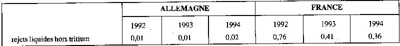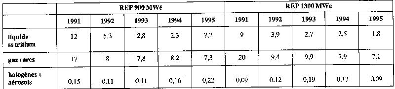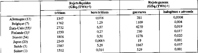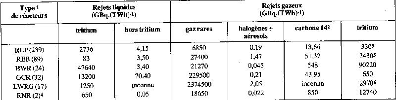2 le Carbone 14 n'est pas mesuré systématiquement, la moyenne est calculée pour les réacteurs pour lesquels l'information existe. 3 Pour les réacteurs français, les rejets gazeux de tritium sont comptabilisés avec les gaz rares. 4 les rejets ne concernent que les réacteurs français. 5 période 88-89. En 87 les rejets sont dus à 80% par 1 réacteur. 6 période 85-89. |