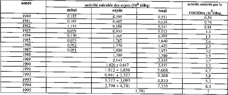 | On observe que l'activité mesurée est presque toujours supérieure à l'activité calculée (notamment entre 1985 et 1991). Cette différence peut s'expliquer notamment par l'imprécision des paramètres utilisés pour le calcul, par un temps de "refroidissement" des combustibles inférieur à trois ans ou une surestimation de la fraction de tritium piégée dans la gaine (sans cependant exclure une imprécision dans la mesure de l'activité rejetée). | Il serait utile de disposer de tous les paramètres connus par