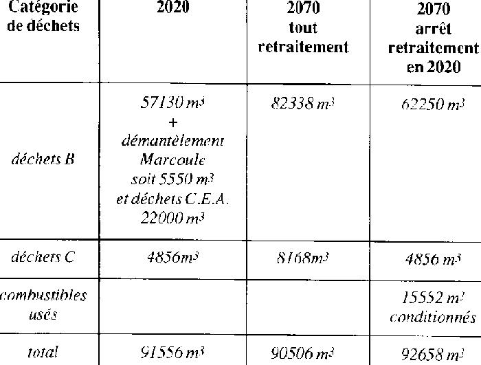 De même on revient sur les RNR au lieu de prévoir des réacteurs à coeur sous modéré, c'est-à-dire on peut se placer dans une zone de fonctionnement du réacteur où l'on fabrique moins d'actinides mineurs et de plutonium. On peut aussi envisager les mélanges uranium-thorium ce qui diminue aussi les actinides mineurs. Bien sûr on ne pourra éviter les produits de fission. Les scénarios envisagent aussi: - les RNR ou non, - le recyclage ou non du Pu dans les REP, - voie A cycle ouvert, stockage des combustible sans retraitement, - voie B cycle partiellement fermé, on retraite mais on prévoit le stockage sans retraitement, - voie C cycle fermé, recyclage en RBP et en RNR, - voie D cycle fermé, recyclage en REP et en RNR, transmutattion des actinides et des produits de fission, - voie E cycle fermé avec REP seulement. L'échéance retenue a été fixée à 2050 pour la mise en place des stratégies. Le niveau de la production nucléaire a été retenu à 400 TWh, équivalent au niveau actuel mais sans plus, car il est précisé que "la mission confiée par les ministres n'était clairement pas de se livrer à un exercice de prospective énergétique ou d'évaluation de l'évolution de l'acceptabilité sociale de telle ou telle stratégie." Décidément, que les citoyens sont ennuyeux quand ils réfléchissent. Quant à parler MOX et stockage de déchets sans avoir le nombre de réacteurset leur chargement cela relève de l'art divinatoire mais justement cet art est peu fiable. A partir de tout ceci, il a été défini 10 scénarios qui ont été examiné sur 6 points: - flexibilité, comment on peut glisser d'une hypothèse à une autre - efforts de R&D, - investissements et intensité économique (nature, capacité et rythme des iinvestissements), - position internationale, - quantités de combustible, plutonium, déchets - impact environnementul. Je trouve intéressant que l'option non retraitement soit considérée dans le rapport comme la moins flexible. C'est une analyse sans fondement d'une part parce que rien n'empêche de retraiter dans 50 ou 100 ans. Ce sera même plus facile car la radioactivité aura décru. D'autre part prendre l'argument du Pu seulement dans ce cas est vraiment très amusant sachant qu'avec un parc de 30 RNR on stabilise tout juste 60 REP. Il faudra donc inéluctablement se résigner à entreposer du Pu. A ce propos les tableaux des annexes sont vraiment fort intéressants même l'ANDRA n'a pas publié de trucs pareils. ESTIMATION ANDRA