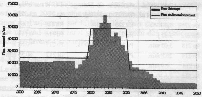 Les déchets TFA sont des déchets constitués de matériaux inertes ou stabilisés dont l'activité est inférieure à 100Bq/g, activité provenant principalement des radionucléides à vie courte ou moyenne. L'inventaire des quantités de déchets TFA produites et à produire n'est pas connu avec une grande précision. En ce qui concerne les quantités provenant du secteur nucléaire, on dispose de données sur les quantités qui seront générées par le démantèlement des installations nucléaires (réacteurs, usines du cycle du combustible, laboratoires,...) et par la réhabilitation des anciens sites nucléaires. En ce qui concerne les déchets TFA produits par le nucléaire diffus, l'évaluation ne peut se faire que très indirectement. On estime que quelques milliers de tonnes/an de déchets TFA pourraient être produits. La quantité totale prévue jusqu'en 2050 est évaluée à 1.300.000 t (voir figure 1) dont le quart pourrait provenir du nucléaire diffus (déchets compris entre 1 et 100Bq/g). A partir des données quantitatives et qualitatives relatives aux déchets issus du secteur nucléaire, on constate que l'activité spécifique moyenne des déchets TFA est de l0Bq/g. A la fermeture du centre, soit 50 ans après la mise en exploitation, l'activité moyenne n'est plus que de 3Bq/g et 100 ans après la fermeture de 2Bq/g. 3. Le concept ANDRA de stockage des déchets TFA