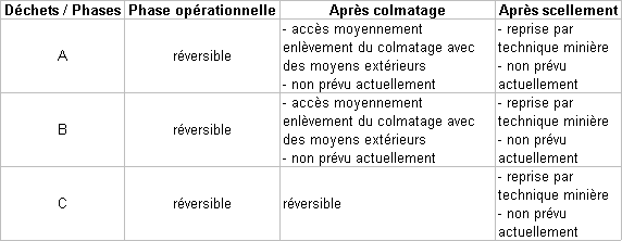 La mise en oeuvre de ces mesures ne peut en aucun cas diminuer le niveau de sûreté du stockage elle ne se conçoit en principe que tant que la première barrière est à même de jouer son rôle de confinement et de protection mécanique. "Les modalités de mise en oeuvre de la réversibilité seront différentes d'une phase de stockage à l'autre; la reprise de déchet est toujours possible, la façon dont on la garantit ou dont on a la facilité évolue d'une phase de stockage à l'autre du stockage. Au niveau officiel, c' est-à-dire des lois et arrêtés correspondants, l'évacuation des déchets radioactifs est définie comme rejet ou dépôt de tels déchets sans intention de récupération. Ceci comprend notamment le dépôt éventuel en surface ou en couches géologiques ainsi que l'immersion dans les limites autorisées par les conventions internationales. La législation ne prévoit donc pas la réersibilité. Mais l'ONDRAF considère toutefois, que "l'intention de ne pas récupérer n'exclut pas ipso-facto que le déchet ne puisse être repris". Pour ce qui concerne la phase d'exploitation du stockage ou "phase opérationnelle", le concept est complètement réversible pour les déchets C. A noter, que pour les déchets C la pose de matériau de colmatage n'intervient pas dans la problématique. La réversibilité proprement dite n'est plus réalisée pour les déchets B ou A après pose du colmatage. A partir de ce moment, la reprise du déchet doit faire appel à des moyens extérieurs. Après fermeture, il est considéré que toute opération de reprise s'apparente à une nouvelle exploitation minière. L'intégrité de confinement est indispensable, ce qui est en faveur d'un suremballage pour les déchets C. Un tableau de synthèse est fourni La situation actuelle du concept belge est résumée dans le tableau ci-dessous. La récupération n'est pas prévue sans pour cela être exclue. Elle peut s'envisager sur une assez longue période avec une difficulté d'accès et de réalisation croissante au cours de la vie du dépôt et tant que la première barrière peut remplir son rôle de confinement et de résistance mécanique. Le stockage des déchets C est réversible jusqu'au scellement; après scellement, le suremballage facilite la reprise du déchet par des techniques minières conventionnelles; si la reprise devenait un élément du concept, il y aurait lieu d'optimiser le suremballage du point de vue de la protection biologique. Le stockage des déchets A et B perd sa réversibilité au fur et à mesure de la pose du matériau de colmatage. Avant scellement, la reprise du déchet se fait par accès direct; après scellement, la reprise du déchet se fait par technique minière conventionnelle. p.4