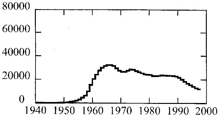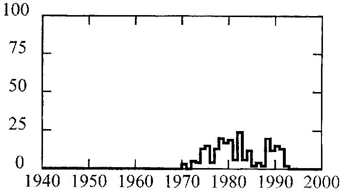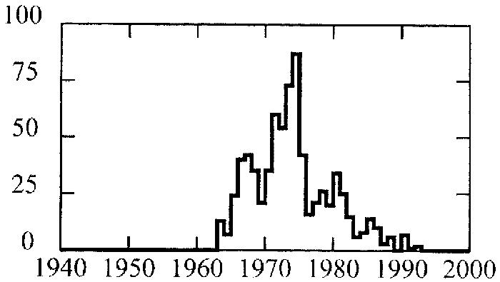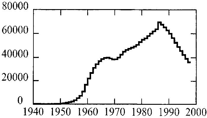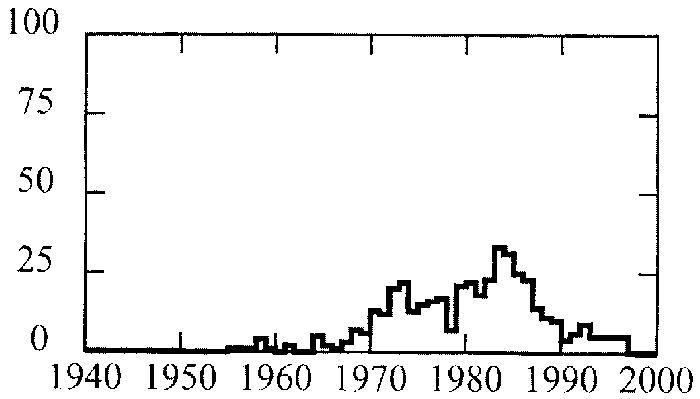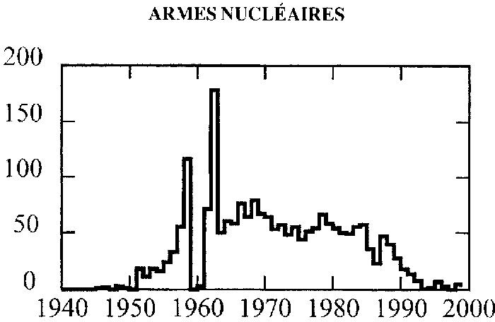 Mais cela ne veux pas dire que de nouvelles armes et de nouvelles formes d'énergie nucléaires ne sont pas en développement... Il est donc intéressant de jeter un regard rétrospectif sur l'évolution historique du nucléaire, depuis son début jusqu'à son déclin actuel, notamment afin de comparer les similitudes et les différences dans des domaines aussi différents que les armes nucléaires, les réacteurs électrogènes, et la recherche nucléaire fondamentale. A cette fin, la dynamique technologique du nucléaire est illustrée par l'histogramme ci-joint, lesquel montre l'évolution année par année d'un certain nombre de statistiques globales entre 1940 et 1997. Il en ressort que l'apogée du nucléaire se situe probablement entre 1970 et 1980, période durant laquelle les plus grands investissements ont été accomplis dans le nucléaire non militaire. ARMES NUCLÉAIRES fin p.25