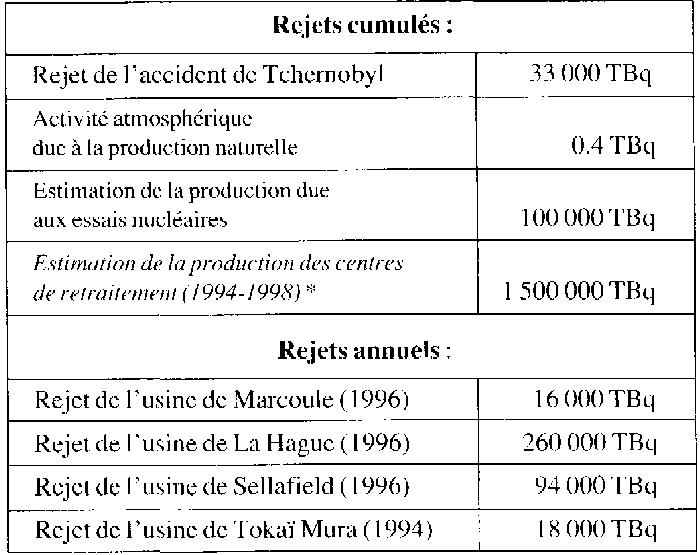 Il en rejette annuellement de l'ordre de 4.l011 Bq. Le reste est rejeté lors du retraitement du combustible irradié ou reste piégé dans les gaines du combustible pour être stocké ultérieurement à l'état de déchets solides. 2.4 Les usines de retraitement