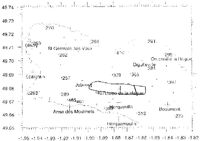 Activité en carbone 14 dans les ajoncs de La Hague (Bq/kg de carbone) Prélèvements réalisés en 1997 ![]() Ce marquage provient à la fois du transfert