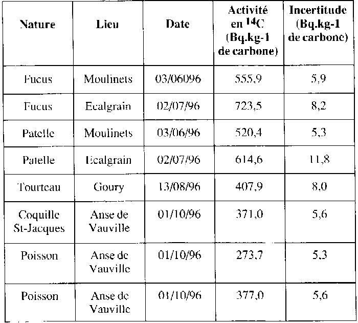 3.2 Milieu marin Dans le milieu marin, des algues (fucus), mollusques et poissons ont été analysés par le LMRE. Les résultats sont présentés sur le tableau 2. La valeur maximale dans le milieu marhi est de 723 Bq.kg-l de carbone et correspond à une algue (fucus) prélevée à Ecalgrain. Résultats des mesures de 14C dans le milieu marin ![]() 4. ÉVALUATION DES DOSES AUTOUR DE LA HAGUE