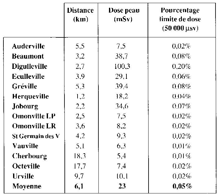 Les données qui précèdent ont été validées dans le cadre du Groupe Radioécologie Nord-Cotentin. Toutefois, celui-ci n'a pas achevé ses travaux et n'a pas encore procédé à l'évaluation de la dose annuelle due aux rejets. Par conséquent, les données qui suivent, calculées et fournies par l'exploitant à partir de ses modèles n'ont pas encore été validées par le groupe. Cette dose est calculée pour le groupe de population le plus exposé à partir de l'activité dans l'air en utilisant un coefficient (coefficient de dose) dont la valeur pour le 85Kr est de 1,1 l0-16 Sv/(Bq.s.m-3). Le calcul de la dose annuelle en un endroit donné nécessite de prendre en compte à la fois: * les périodes de l'année durant lesquelles cet endroit n'est pas situé sous le panache du rejet, et par conséquent, pendant lesquelles les niveaux de krypton sont très faibles; (suite)