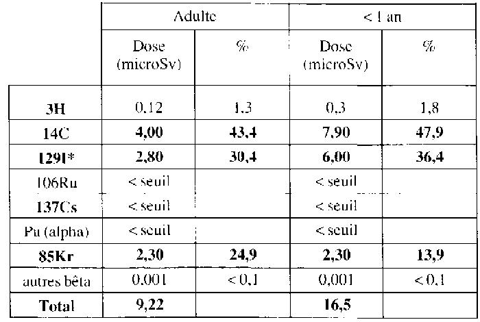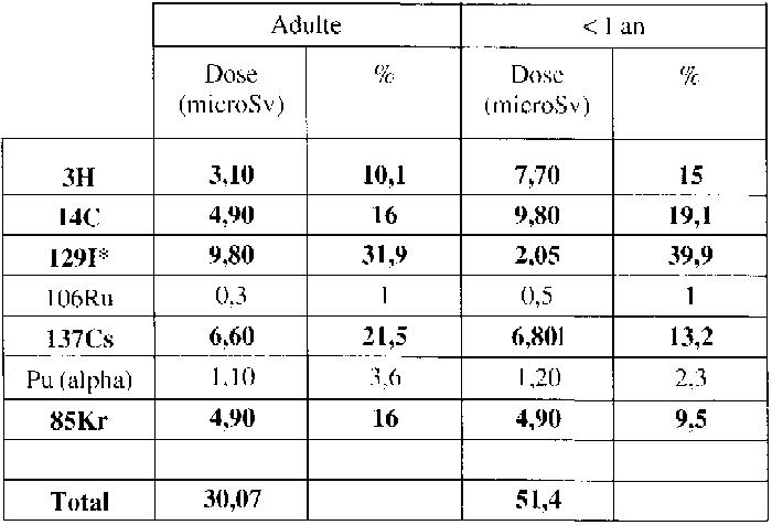 | Sur la base des rejets réels d'iode 129 présentés par COGEMA depuis 1966, la dose à la thyroïde reçue par le groupe de référence a été maximale en 1996 et est évaluée à 231 microSv. Nous rappelons que la dose à un organe traduit un risque sur un seul organe alors que la dose efficace traduit un risque sur l'organisme entier. | Cinq radionucléides contribuent de façon