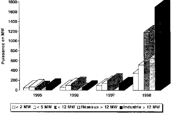 Ils se répartissent de la manière suivante: - 61 contrats de moins de 1 MW représentant 53 MW - 216 contrats entre 1 et 8 MW représentant 729 MW - 11 contrats de plus de 8 MW représentant 157 MW pour les réseaux de chaleur - 20 contrats de plus de 8 MW représentant 606 MW pour le secteur industriel. Les techniques de cogénération installées depuis ces dernières années ou en projet sont en général des moteurs fonctionnant au gaz naturel pour les petites puissances et des turbines à combustion au-delà de quelques MW. Quel avenir pour la cogénération