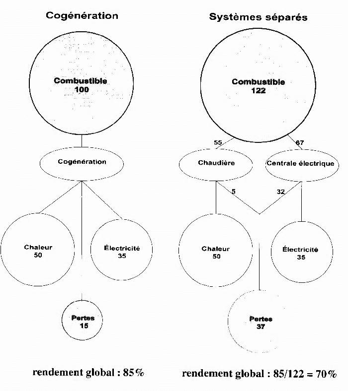 On distingue trois grandes familles de cogénération: - la turbine à vapeur: depuis de nombreuses décennies cette technique est utilisée couramment par les industriels qui ont des besoins importants de chaleur et d'électricité (chimie, papeterie, sucrerie, . . .). - Le moteur thermique: il fonctionne généralement au fioul domestique ou au gaz et est particulièrement adapté au chauffage de locaux pour des puissances limitées. - La turbine à combustion: c'est à partir du milieu des années 80 que cette technique (turbine aérodérivative) s'est développée, essentiellement dans l'industrie et les réseaux de chaleur ou les hôpitaux ayant des besoins énergétiques importants. Ces différentes techniques produisent de façon combinée et simultanée de l'énergie thermique et de l'énergie mécanique: - L'énergie thermique est récupérée sur les gaz d'échappement et les circuits de refroidissement des moteurs ou turbines à gaz ou sur la vapeur détendue dans les turbines à vapeur. - L'énergie mécanique qui est aujourd'hui, dans la quasi-totalité des cas, transformée en électricité par couplage avec un alternateur, peut également entraîner directement des compresseurs, ventilateurs, pompes... Les avantages de la cogénération La différence essentielle