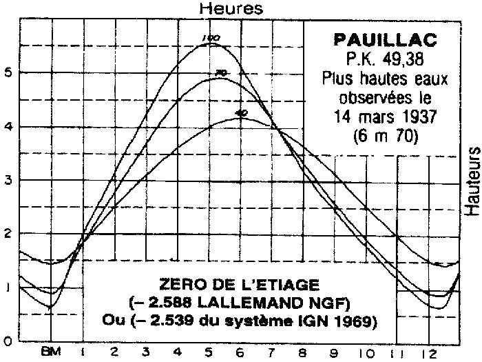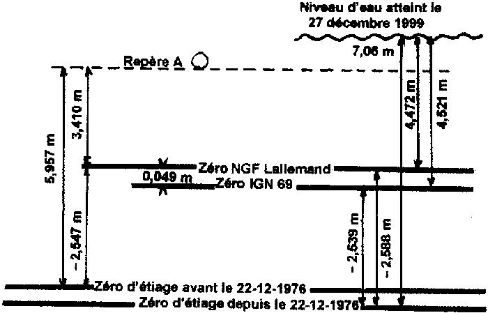 Le zéro d'étiage à Pauillac est à la cote - 2,588 m du zéro Lallemand NGF ou encore à - 2,539 m du zéro IGN 69. Nous conserverons le système Lallemand qui est celui utilisé dans les documents EDF, DSIN, IPSN et par la Port Autonome de Bordeaux. (De toutes façons la différence n'est que de 4,9 centimètres et importe peu par rapport à des hauteurs observées de plusieurs mètres). Les cotes terrestres correspondant aux niveaux d'eau atteints sont données par : cote=hauteur d'eau (par rapport au zéro d'étiage) + cote (négative) du zéro d'étiage. Ainsi à un enregistrement marégraphique correspondant à une hauteur d'eau de 5,05 mètres, valeur prévue pour le coefficient de marée 77 dans la soirée du 27 décembre 1999 à Pauillac, il correspond une cote terrestre de 5,05-2,588=2,46 mNGF (2,51 m IGN 69) alors qu'on a observé 7,06 m soit 4,47 mNGF (4,51 m IGN 69) correspondant à une surcote de 2,01 m. Signalons que le marégraphe de Pauillac a été déplacé en 1976. Avant 1976 le zéro d'étiage était à –2,547 mNGF du zéro Lallemand qui doit être appliqué aux données de 1937 et 1941. M. Jehan (SHOM) nous a donné des informations sur les repères de nivellement. Le repère A du Nivellement Général de la France est fixé sur le mur du quai de l'estacade du bac à Pauillac. Il a représenté schématiquement les différents zéros que nous reproduisons ci-dessous. Nivellement à Pauillac: ![]() Annexe 2