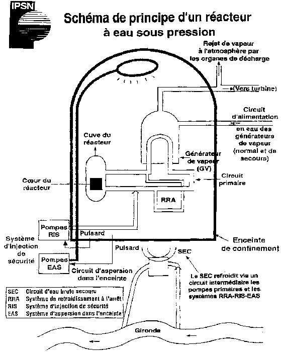 Après 2 h 55 (DSIN) - 3 h 00 (EDF). EDF, CNPE du Blayais : à 3 h la centrale mobilise ses équipes de crise pour renforcer les équipes présentes et informe les services nationaux d'EDF et la DRIRE. A 3 h 15 les équipes nationales de crise sont mobilisées, à 3 h 30 la DSIN est informée par les services nationaux d'EDF. Pour la DSIN ceci correspond au déclenchement par le site à 2 h 55 du PUI niveau 1 (Plan d'urgence conventionnel, non radiologique) qui aurait dû, d'après elle, être déclenché la veille à 23h. La préfecture est prévenue. Le pompage de l'eau commence mais le niveau ne baisse pas. Comme c'est la première fois qu'une organisation nationale de crise est déclenchée en France nous donnons la suite de la chronologie d'après la DSIN : "À 5 h 45 : EDF fait part de son intention de faire appel à l'organisation nationale de crise EDF et à l'IPSN. Le directeur de la DSIN en est informé et donne son accord. Vers 6h00 : Constitution de l'équipe de crise IPSN, opérationnelle vers 7 h 00. 7h30 : Premier communiqué de presse d'EDF informant de l'arrêt des installations. 8h23 : Brusque aggravation de la situation. Inondation des locaux pompes SEC de la tranche 1. Perte de la voie A du SEC. Incertitudes sur la possible inondation de la voie B. 8h30 : Le directeur de la DSIN est informé de la situation et demande à EDF de déclencher le PUI de niveau 2 [ou PUI radiologique intérieur]. Lancement du gréement du poste de commandement de la direction de la DSIN (PCD DSIN). Prise de contact avec EDF national et du site du Blayais, équipe de crise IPSN, COAD [Centre Opérationnel et d'Aide à la Décision de la Direction de la Défense et de la Sécurité civiles], Préfecture, Office de Protection contre les Rayonnements ionisants (OPRI), DIN locale (Division des installations nucléaires, DRIRE-Aquitaine). 9h10 : lancement du signal d'alerte par EDF (bip de l'ensemble des agents de l'Autorité de sûreté) [D'après EDF, en complément des équipes déjà mobilisées depuis 3h du matin, 80 personnes d'astreinte sont venues rejoindre les équipes de conduite]. 9h30 : première information des cabinets de la Ministre de l'Aménagement du territoire, de l'Environnement et du secrétaire d'État à l'Industrie 10h35 : premier communiqué de presse de la DSIN faisant état du déclenchement du PUI par EDF et de la mise en place d'une équipe de crise. 10h40 : le pompage fonctionne dans les alvéoles SEC, le niveau baisse. Le risque de perte de la voie B s'éloigne. Entre le 28 décembre 11 h et le 29 décembre 20 h : équipes de crise mobilisées 24h/24. Amélioration progressive de la situation technique (pompage de l'eau, fiabilisation progressive des alimentations électriques). Les réacteurs 1 et 2 restent en état d'arrêt avec refroidissement par les générateurs de vapeur jugé le plus sûr. Classement de l'incident au niveau 2 par la DSIN le 29 décembre à 7 h. Communiqués de presse n°2 à 6 émis par la DSIN. Trois conférences de presse "tempête" par le préfet de police de la Gironde où est présentée la situation du Blayais. 30 décembre : redémarrage du réacteur 4. Allégement du dispositif de crise. Fonctionnement de la voie A du SEC [du réacteur1] après changement d'un moteur. L'Autorité de sûreté soumet à autorisation le redémarrage des réacteurs 1 et 2. Communiqués de presse n°7 et 8 ". Ainsi, tout s'est finalement bien passé. Il faut voir cela de plus près car la situation, pas très brillante, aurait pu empirer. III – Les problèmes liés à la dégradation de la sûreté du réacteur 1 : perte des circuits EAS, RIS, d'une voie du circuit SEC. En fonctionnement normal la pression est de 155 bars et la température de 280°C dans le circuit primaire. (suite)