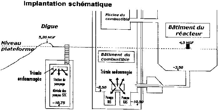 Ceci peut apparaître comme une chicanerie administrative. Ce point a cependant son importance car l'alarme de haut niveau Gironde peut permettre de baisser préventivement la puissance des réacteurs dans de bonnes conditions ce qui diminue la puissance résiduelle à évacuer après arrêt ultérieur. Qu'il faille ou non déclencher le plan d'urgence interne, le fait est que le site était comme une forteresse assiégée et que du personnel supplémentaire ne pouvait pas parvenir à la centrale les routes étant impraticables. D'après la DRIRE contactée le 15 mars, le rapport officiel EDF sur l'incident donnerait une version complètement différente. Il ne serait plus question d'un signal de haut niveau Gironde reçu à 23h en provenance d'un marégraphe mais d'une alarme " défaut du marégraphe " apparaissant à 20h30 indiquant qu'aucune information n'était plus reçue en provenance des stations marégraphiques tant du Verdon que du Richard. D'autre part sur le site même de la centrale, dans un bassin par où transite l'eau pompée en Gironde, il y a des indicateurs de niveaux d'eau dans ce qu'on appelle les " cheminées d'équilibre " de la station de pompage du circuit CRF de refroidissement des condenseurs avec des alarmes de haut niveau et de bas niveau (quand les tambours de filtration sont encrassés). Il y a eu à 22h des indications de niveaux hauts dans ces cheminées, signe de la montée de l'eau en Gironde ce qui aurait dû déclencher la procédure incidentelle I CRF relative aux pompes CRF or cela n'a pas été fait (et d'après l'IPSN déclenchement du PUI de niveau 2 comme indiqué précédemment). Avec cette nouvelle version qui renforce le facteur tempête il devient encore plus manifeste que la puissance du réacteur-1 encore en marche aurait dû être baissée préventivement. (Il est cependant possible que la première version soit aussi valable et qu'un signal de haut niveau Gironde ait pu être reçu à 22h par le réacteur 4 si l'émetteur du marégraphe fonctionnait par intermittence. Voir Annexe 2). Entre temps avec la marée montante (pleine mer à 21h52 ce qui correspond sensiblement aux indications de la station de pompage) des paquets d'eau ont déboulé sur le site, déformant des portes coupe-feu, enfonçant des obturations autour du passage de câbles et tuyauteries, passant par les trémies et l'eau s'est infiltrée progressivement dans les galeries techniques souterraines des réacteurs 1 et 2. 2) Problèmes sur les circuits de sauvegarde Réacteur-2 23h59, selon EDF, l'équipe de conduite du réacteur-2 est " alertée par l'alarme de présence d'eau dans les 4 puisards RIS et EAS du bâtiment du combustible. La personne envoyée sur place constate alors la montée rapide de l'eau ". Le schéma ci-dessous a été publié par l'IPSN [4]. Il donne les niveaux de calage de la plate-forme et d'implantation des réacteurs et permet de comprendre l'inondation des galeries souterraines et la perte d'équipements importants pour la sûreté: (suite)