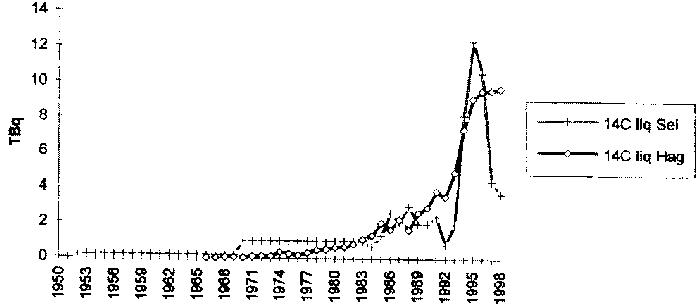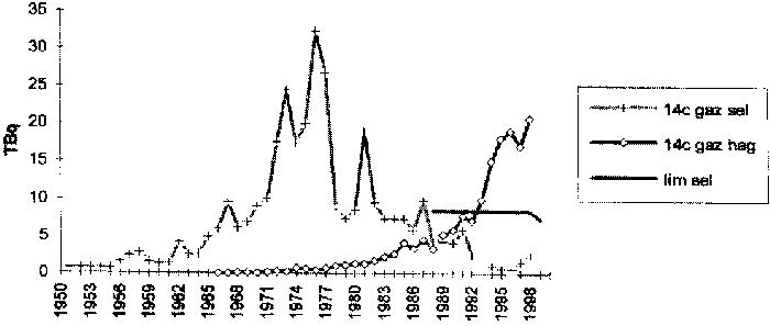L'évolution comparée des rejets liquides des deux sites de retraitement peut être visualisée par le graphique ci-après : Rejets liquides de carbone 14 à Sellafield et à la Hague ![]() 3) Le 14C est un des radioéléments les
