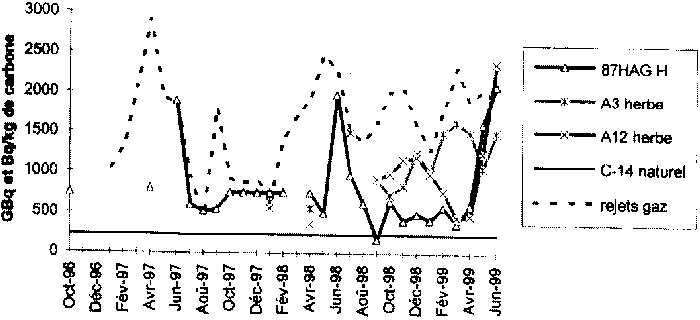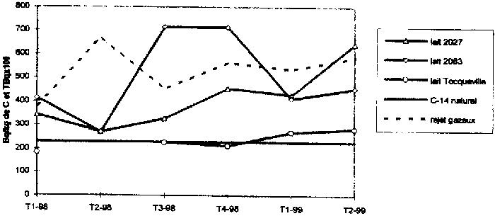 1) Avertissement Pour "lire" le 14C dans les relevés des analyses effectuées dans l'environnement de la Hague, il faut ramener les différentes expressions à l'activité du 14C par kg de carbone naturel et pouvoir comparer avec l'activité normale du 14C dans la nature : 230 Bq/kg de carbone, c'est ce que fait l'OPRI depuis août 1998 dans ses analyses d'herbe. Les données COGEMA sont, elles, exprimées en Bq/kg frais, valeur que nous pouvons ramener en expression carbone à partir des données utilisées par les autorités de sûreté anglaises pour la surveillance des sites nucléaires de Grande Bretagne, [RIFE 1] : Exemples : - lait, teneur en carbone 7%, concentration en 14C 18 Bq/l - légumes verts, légumes racine, teneur en carbone 3%, concentration en 14C 8 Bq/kg frais - pour l'herbe, nous pouvons convertir l'activité exprimée en Bq/kg frais => Bq/kg sec en prenant en compte une teneur en eau moyenne de 80% du poids frais (poids sec/poids frais =1/5), et ensuite calculer l'activité 14C dans le carbone à partir d'une teneur standard de 40% de carbone dans la matière sèche pour l'herbe (cf relevés mensuels OPRI 98 à 99) - pour les produits marins, nous utiliserons les ratios poids frais / poids sec et les teneurs en carbone retenues dans [COO 97], concernant les mollusques et les crustacés, et les valeurs moyennes poids frais / poids sec de 12 mesures de fucus serratus effectuées par l'ACRO en 1999 et la moyenne des teneurs en carbone de cet indicateur dans les travaux COGEMA-IPSN de 96/98. 2) 14C dans le lait de 2 exploitations, données COGEMA, mesures disponibles à partir de janvier 1998, la première expression est en Bq/l, la deuxième () en Bq/kg de carbone.