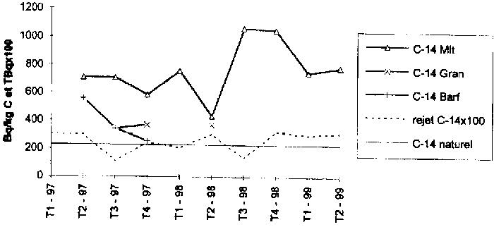 Si l'on suit le raisonnement de l'OPRI dans son document [OPRI 97-2], relever une activité en 14C de 900 Bq/kg de carbone pouvait induire une dose efficace de 50 ?Sv en 1996 pour le groupe de population critique, en 1999 les relevés dans l'environnement donnent des mesures à plus de 2000 Bq/kg on peut donc s'attendre à des doses efficaces voisine de 100 ?Sv pour les mêmes populations avec le seul 14C. Le 1/10 de la dose population selon la norme européenne, valeur seuil de l'optimisation des installations par l'exploitant pour tous ses rejets en fonctionnement nominal (4.6.B, page 35), serait donc atteint actuellement avec un rejet 14C gazeux en 1998 de 20,7 TBq, on peut se poser la question de "l'optimisation" quand on lit une demande de rejets nominaux à 28 TBq. p.25