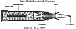 Il contient 0,2 % d'uranium 235 et 99,75 % d'uranium 238, le reste étant constitué d'isotopes. Ce métal est largement utilisé en radioprotection car il arrête les rayons gamma de façon plus efficace que le plomb. L'uranium appauvri est donc un déchet qui a une activité spécifique de 3,900 Bq/g pour les émetteurs alpha, c'est à dire environ la moitié de la radioactivité de l'uranium naturel Pourquoi de 1'UA dans les armes ?