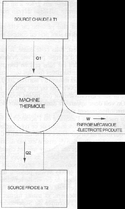 Figure 1: Le rendement maximum d'une machine thermique idéale fonctionnant suivant le cycle de Carnot est nettement inférieur à 1. Ceci vient du fait qu'une partie importante (Q2) de la chaleur produite (Q) par la source chaude doit se transférer à l asource froide pour que la machien tourne. L'énergie primaire transformable en électricité n'est que: W = Q1 - Q2. Le rendement des machines thermiques réelles se situe entre 20 et 40%