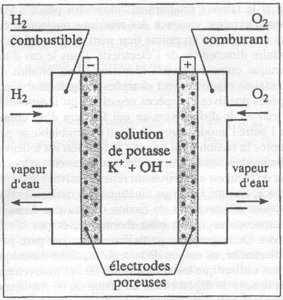 Les piles à combustibles ont de suite été adoptées pour les engins spatiaux habités : dans les capsules Apollo et Gemini, à partir d'O2 et H2 liquides elles ont fourni à la fois l'énergie et l'eau nécessaires aux cosmonautes. De nombreux modèles sont en cours de développement pour des utilisations courantes, en fonction de la nature de l'électrolyte, de la technologie des électrodes, du catalyseur, du combustible (qui n'est pas forcément directement l'hydrogène, l'oxydant étant généralement l'oxygène de l'air), et la température de fonctionnement, qui peut aller de 80 jusqu'à 1000 °C suivant les filières. La technologie des piles à combustibles "à oxydes solides" et fonctionnant à haute température (850-900 °C) serait à même de battre sur leur propre terrain à la fois la combustion classique ("à flamme") et le nucléaire haute température : débouchant sur une turbine à gaz, son rendement électrique atteindrait 70 %, au lieu de 50 % pour ces concurrents.[*](voir en fin d'article)