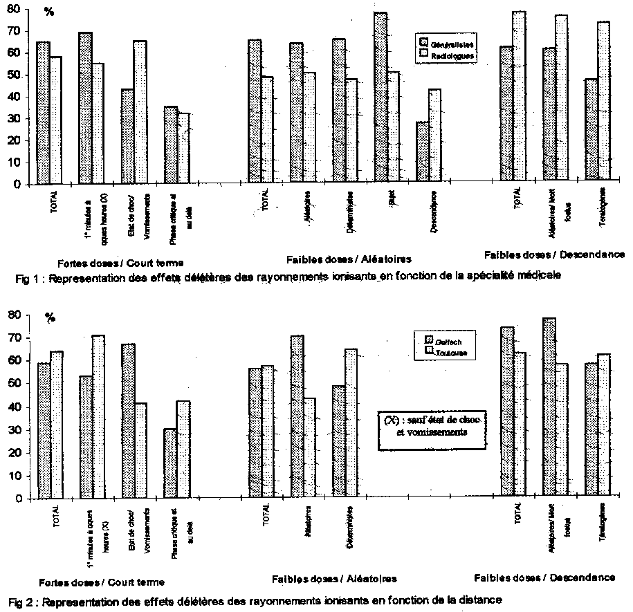 Media et information écrite sont plus valorisés à Toulouse, alors qu'à proximité du site c'est le canal oral et (inter-)actif. Quant à la confiance dans la source d'information, les radiologues font plus confiance que les généralistes aux organismes impliqués dans le nucléaire (25 % contre 12 %), les généralistes s'en défient beaucoup plus (65 % contre 37 % pour les radiologues). Seul le Commissariat à l'Energie Atomique bénéficie de la confiance des radiologues (50 % contre 0 % à EDF) et EDF est le principal bénéficiaire de la défiance des généralistes (83 % contre 46 % au CEA). Les radiologues se défient moins de la classe politique (gouvernement, élus locaux, hommes politiques) que les généralistes (79 % contre 92 %), et ils ne placent aucune confiance dans les journalistes (0 % contre 33 % chez les généralistes). Curieusement, les écologistes sont crédités de la même confiance et de la même défiance par les deux spécialités médicales (10 % et 70 %, 3 % et 74 %). Ceci est probablement imputable autant à l'image de la compétence qu'à la confiance qui leur est accordée (3). Aucun médecin de Golfech n'accorde de crédit aux journalistes, pas plus d'ailleurs qu'à EDF. C'est surtout à Golfech que le CEA puise son crédit de confiance, et à Toulouse qu'EDF inspire le plus de méfiance, la classe politique et les acteurs indépendants (écologistes, journalistes) le plus de confiance. Au-delà de la mise à l'épreuve de l'hypothèse, cette étude fait en outre apparaître des scores comparables pour la connaissance des effets déterministes des faibles doses et des fortes doses, des effets aléatoires des faibles doses, de la distinction effets aléatoires / déterministes (54 % - 59 %), des effets sur la descendance (67 % - 69 %). Le taux de bonnes réponses semble décroître avec le temps de latence de l'effet déterministe (1ères minutes à quelques heures ou phase critique : 57% - 67%, syndrome digestif : 50 %, stérilité : 22 %). (suite)