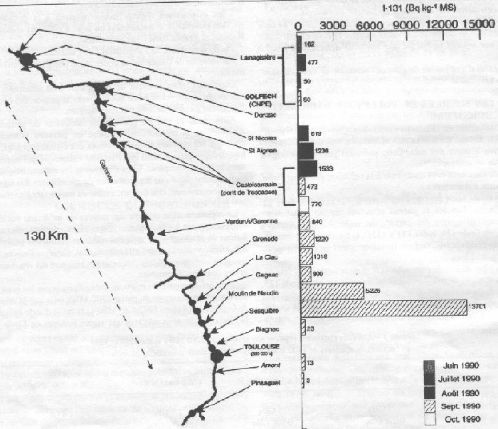 Après la divergence de la centrale (mai 1990), les mesures réalisées sur les plantes aquatiques prélevées en 16 points différents de la Garonne ont fait apparaître une contamination significative des échantillons de Myriophyllum spicatum L. par l'iode 131, contamination d'autant plus importante que l'on remontait la Garonne de l'aval de la centrale de Golfech jusqu'à l'aval de la ville de Toulouse (130 km de Golfech, 350.000 hts), où l'activité maximum de 13.701 +- 1.443 Bq/kg de matière sèche a été mesurée. Aucune contamination n'a été détectée en amont de Toulouse [6]: Contamination de Myriophyllum spicatum L. par l'iode 131 dans la