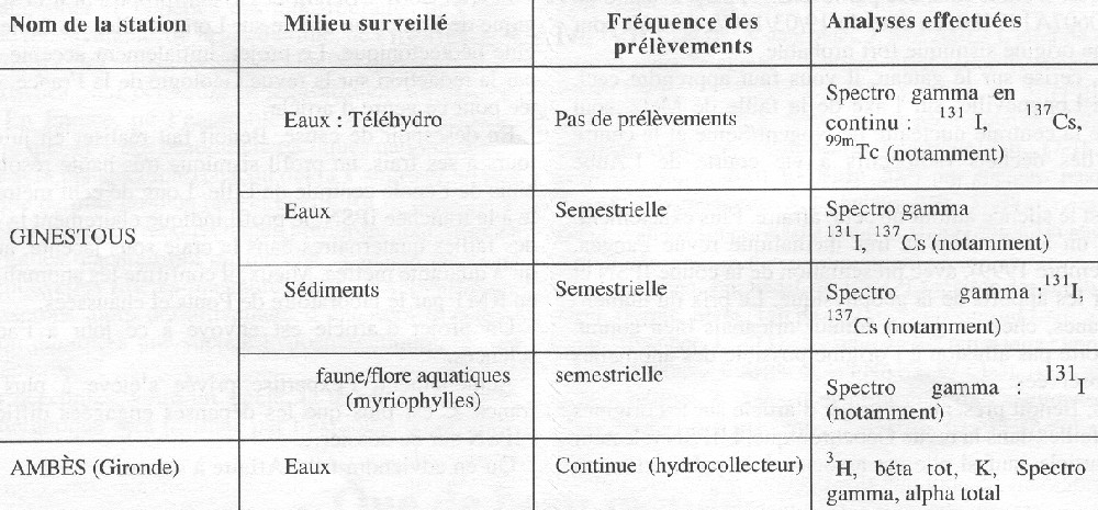 Indépendamment du dispositif autour de la centrale, en particulier au niveau de la station dite “ à mi-rejet ” géographiquement située à Laspeyres, sur la commune de Saint-Romain-le-Noble, en aval de Golfech, la surveillance générale et systématique de la Garonne s'exerce principalement en aval de Toulouse, au niveau de la station d'épuration de Ginestous, et en aval de Bordeaux, à Ambès. Depuis juin 2001, la surveillance à Ginestous a été renforcée par une balise de mesure automatique “ Téléhydro ”, qui contrôle en continu la radioactivité des eaux usées. Les analyses effectuées dans ces deux stations figurent dans ce tableau: ![]() L'OPRI pratique ses mesures de radioactivité de manière indépendante et vérifie aussi que l'exploitant respecte les prescriptions de l'arrêté. Dans la pratique, il dispose de deux hydrocollecteurs installés à Laspeyres, dont l'un appartenant à EDF. Chaque semaine, l'OPRI récupère les prélèvements correspondants, sur lesquels il réalise des mesures de spectrométrie gamma, d'activité alpha global et béta global. Les résultats sont transmis mensuellement aux autorités. Afin de répondre à de préoccupations récemment exprimées, le dispositif de l'OPRI a été renforcé depuis février 2001 par une analyse cinq jours sur sept d'un prélèvement ponctuel d'eau de la Garonne, effectué en amont immédiat d'Agen. En outre, il est prévu d'installer d'ici l'automne, sur le site de la Compagnie des eaux et de l'ozone à Sivoizac, une balise “ Téléhydro ” identique à celle de Ginestous pour contrôler la qualité de l'eau distribuée dans l'agglomération d'Agen. Elle fonctionnera dans l'attente de la mise en service par l'OPRI, en aval de Golfech, d'un équipement plus complet, apte à mesurer la radioactivité en permanence, à signaler des incidents et à prélever des échantillons représentatifs. Ainsi, d'ici quelques mois, la Garonne serait dotée de trois équipements de mesure automatique de la radioactivité, dont un déjà en place, en aval de Toulouse, un en amont d'Agen et un dernier au niveau de l'agglomération bordelaise. p.6