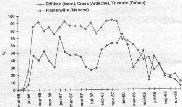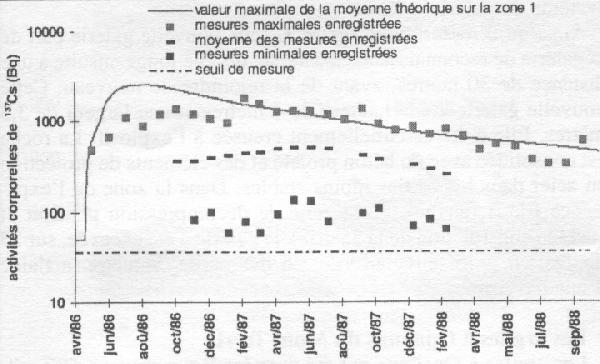 L'analyse des plus de 60 000 contrôles effectués, de mai 1986 à avril 1989, sur 17 de ces sites répartis sur l'ensemble du territoire montre que les conséquences des retombées de l'accident de Tchernobyl sont effectivement visibles dans les mesures anthropogammamétriques. (suite)