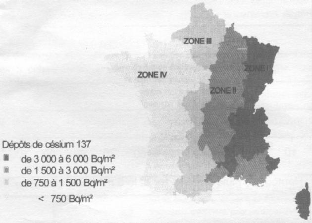 page 55 à 57 Ces différents travaux ont permis de disposer d'une bonne connaissance d'ensemble du niveau de contamination du territoire français dû aux retombées radioactives de l'accident de Tchernobyl, ainsi que de l'impact dosimétrique sur la population, Toutefois, deux aspects particuliers ont donné lieu à des études plus approfondies, dont les résultats ont été obtenus au cours de l'année 2000: · l'évaluation des conséquences sanitaires de l'accident de Tchernobyl en France: en janvier 2000, la DGS a demandé à l'IPSN et à l'Institut national de Veille Sanitaire (InVS), de lui fournir un état des connaissances sur les conséquences sanitaires de l'accident de Tchernobyl ainsi qu'une analyse sur les investigations qu'il conviendrait de mener en France pour mettre en évidence d'éventuels effets de cet accident sur la santé, notamment concernant les cancers de la thyroïde. Ce travail a donné lieu à un rapport (3) remis a la DGS et publié en décembre 2000; · l'amélioration de la connaissance de la contamination des territoires français les plus fortement touchés par les retombées de l'accident de Tchernobyl. I- Évaluation des conséquences sanitaires de l'accident de Tchernobyl en France 1.1. Rappel des principaux résultats de l'évaluation des conséquences radioécologiques et dosimétriques L'étude menée par I'IPSN en 1997 fournit une estimation par département des dépôts radioactifs sur les sols agricoles, établie à partir des mesures effectuées dans les sols, le lait et les légumes -feuilles en 1986. Les résultats montrent qu'il existe un gradient des dépôts d'est en ouest, selon quatre zones. · La zone la plus contaminée (zone I, cf. figure 16) s'étend à l'est d'une ligne Gard/Moselle. Dans cette zone, les dépôts moyens de 137Cs, exprimés sous forme d'activité surfacique des surfaces agricoles, allaient de 3.000 à 60.00 Bq/m 2 et ceux d'iode 131 de 20.000 à 50.000 Bq/m2. Les valeurs de dépôts corrigées de la décroissance radioactive, sont ramenées à leur valeur de 1986. · Dans la zone la moins contaminée de France (zone IV), à l'ouest d'une ligne Haute-Garonne/Seine-Maritime, les ASR étaient inférieures à 750 Bq/m2 pour le 137 Cs et 5.000 Bq/m2 pour l'iode-131