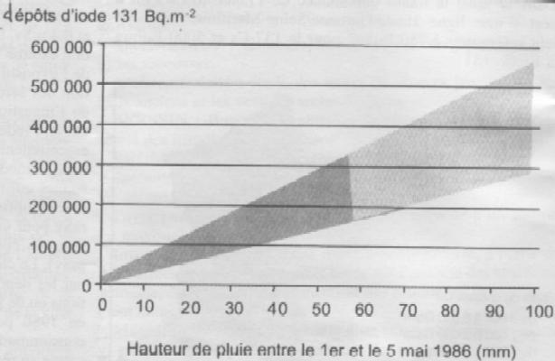 Figure 22: Relation théorique entre les dépôts d'iode 131 et les hauteurs de pluies au cours de la première semaine de mai 1986 Cette relation appliquée aux hauteurs de pluie mesurées par Météo-France entre le 1er et le 5 mai 1986 a permis d'établir une carte théorique des dépôts d'iode 131 (Figure 23). Une limite importante quant à la validité de cette cartographie est liée à la couverture des mesures effectuées par Meteo France et au caractère sporadique des précipitations : certains endroits ont pu recevoir des précipitations plus ou moins importantes sans qu'aucune station de Météo-France n'ait pu en témoigner. Sous ces réserves, la carte fait apparaître trois grandes zones: la zone A sur laquelle les dépôts d'iode 131 ont été plus faibles ou du même ordre de grandeur que le dépôt moyen départemental sur les surfaces agricoles de l'Est de la France continentale, la zone B sur laquelle les dépôts ont pu être jusqu'à 3 fois supérieurs à ce dépôt moyen, et la zone C qui figure parmi les plus touchées de l'Est de la France. 2.3.3. Interprétation des mesures