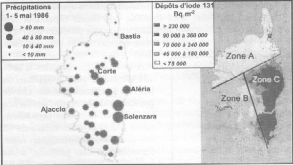 Figure 23 : Répartition des stations de Météo-France en Corse, hauteurs de pluies enregistrées entre le 1er et le 5 mai 1986 et carte des dépôts théoriques d'iode 131 sur l'île. Le logiciel ASTRAL a permis de vérifier