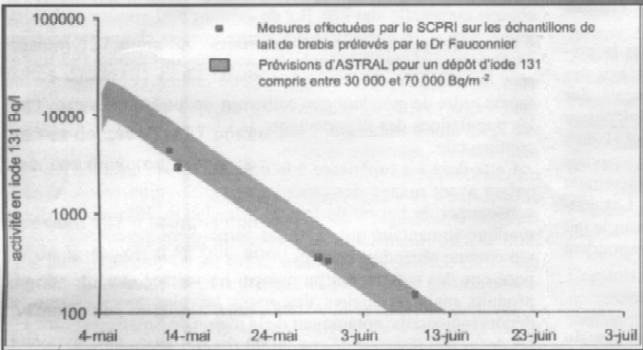 Figure 24 : évolution des activités de l'iode 131 mesurées dans des échantillons de lait de brebis de Belagne et dépôt théorique correspondant estimé par modélisation. Les activités mesurées dans les échantillons de lait de vache prélevés dans la région d'Ajaccio et de Propriano, sont inférieures à celles attendues dans le lait de vaches nourries d'affouragements verts locaux. Les précipitations très variables dans cette région (22 mm à 34 mm) ont sans doute conduit à des dépôts et à une contamination des fourrages donnés aux bovins très variables. Les autres mesures d'iode 131 portant sur des fromages ou des foins, sont plus difficiles à interpréter sans informations complémentaires. Dans le cas d'un fromage, il est nécessaire de faire des hypothèses sur le procédé et le délai de fabrication. Toutefois, l'activité de 7 Bq.kg mesurée début juillet 1986 par l'IPSN dans un échantillon de fromage de brebis provenant de Balagne, semble assez cohérente avec une activité initiale du lait de l'ordre de 15.000 Bq.l-1 ce qui correspond aux activités mesurées dans le lait de Balagne.