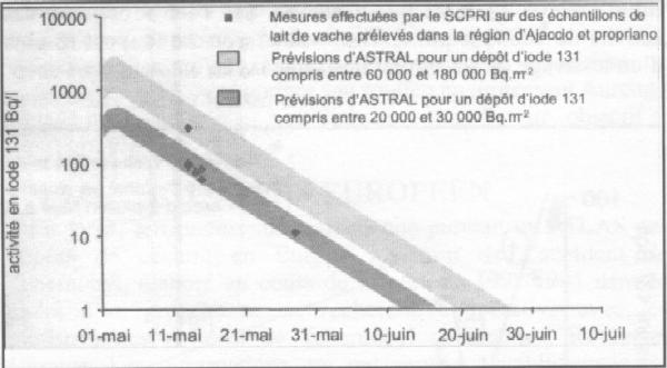 Figure 25 : évolution des activités de l'iode 131 mesurées dans des échantillons de lait de vache de la région d'Ajaccio et de Propriano et dépôt théorique correspondant estimé par modélisation. (