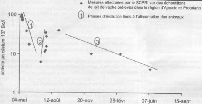 Figure 26 : Evolution du césium 137 dans le lait de vache prélevé dans la région d'Ajaccio par le SCPRI au cours du mois qui a suivi les dépôts. Cet ensemble de mesures effectuées dans la région d'Aleria-Ghisonaccia permet d'évaluer l'activité de l'iode 131 déposé dans cette région entre 100.000 et 350.000 Bq.m-2, ce qui constitue un élément de validation de la carte des dépôts établie sur la base des précipitations. 2.3.5. Contamination de la chaîne