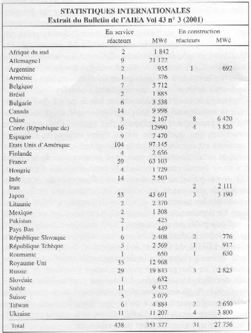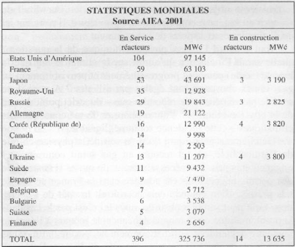 Malgré une baisse très nette des programmes d'équipement par rapport aux années 70 et 80, on continue à observer dans le Monde une croissance de la production nucléaire globale et la volonté d'un certain nombre de pays d'augmenter leur parc. C'est le continuent asiatique avec le Japon, la Chine, la Corée et l'Inde qui représente la majorité des 32 réacteurs nucléaires en construction. Si la plupart des pays occidentaux ont arrêté de construire des centrales, plusieurs envisagent l'avenir et le renouvellement des capacités actuelles. Aux États-Unis, le plan national énergétique “ Bush ”, adopté en mai 2001, prône une relance du nucléaire. Le seul maintien de la part actuelle du nucléaire dans la production d'électricité d'ici 2020 nécessiterait la construction de plusieurs dizaines de réacteurs pour compenser la fermeture des unités devenues obsolètes et pour suivre la croissance globale de la consommation. En Finlande, l'électricien TVO a déposé la demande de construction d'un cinquième réacteur. Cette décision a été approuvée sur le principe par le Gouvernement en début d'année puis par le Parlement finlandais en mai dernier. Au Royaume-Uni, le rapport demandé par le Premier ministre sur la politique énergétique d'ici 2050, publié le 14 février 2002, recommande, entre autres, de laisser ouverte la possibilité de nouveaux investissements nucléaires. Depuis la mise en service en 1999 du 58ème réacteur à eau pressurisée d'EDF, la France affiche une logique de maintien de l'option nucléaire ouverte à l'échéance du renouvellement du parc. La réflexion internationale sur la