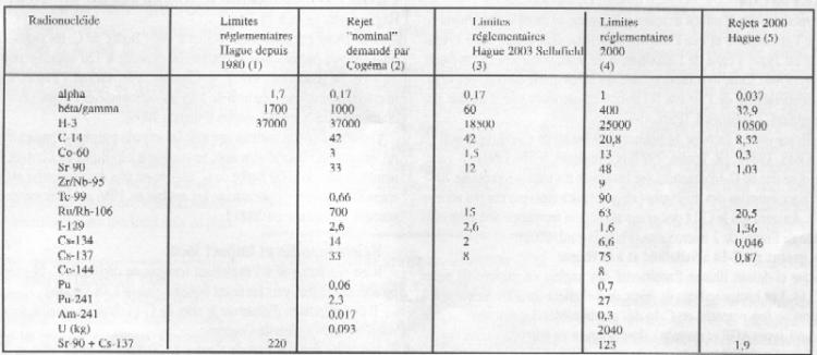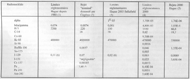 Les installations nucléaires du site de la Hague ont été autorisées à fonctionner par décrets très discrets parus en 1966, seule l'activité principale des différentes installations nucléaires y était mentionnée en 3 lignes. Ce n'est qu'à partir de 1980 qu'une autorisation de rejets liquides et gazeux a été officialisée sous une forme très globale : rejets “ béta et gamma”, seuls le tritium, le strontium plus le césium pour les rejets liquides, et le tritium ainsi que le krypton et les halogènes (les iodes) pour les rejets gazeux faisaient l'objet d'une restriction particulière. Il a fallu attendre 2003 (23 ans !) pour que les autorités en charge de la santé publique imposent à l'exploitant des limites de rejets plus détaillées et un peu moins “larges” à l'instar de leurs homologues anglais qui procèdent ainsi depuis plus de 10 ans. Nous comparons ci-après les autorisations Sellafield et la Hague, ainsi que les rejets déclarés par Cogéma la Hague en 2000: