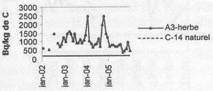 ![]() Illustration des variations du taux de C-14 dans l'herbe dans l'environnement proche du site de la Hague, exemple du point A3, commune de Digulleville: